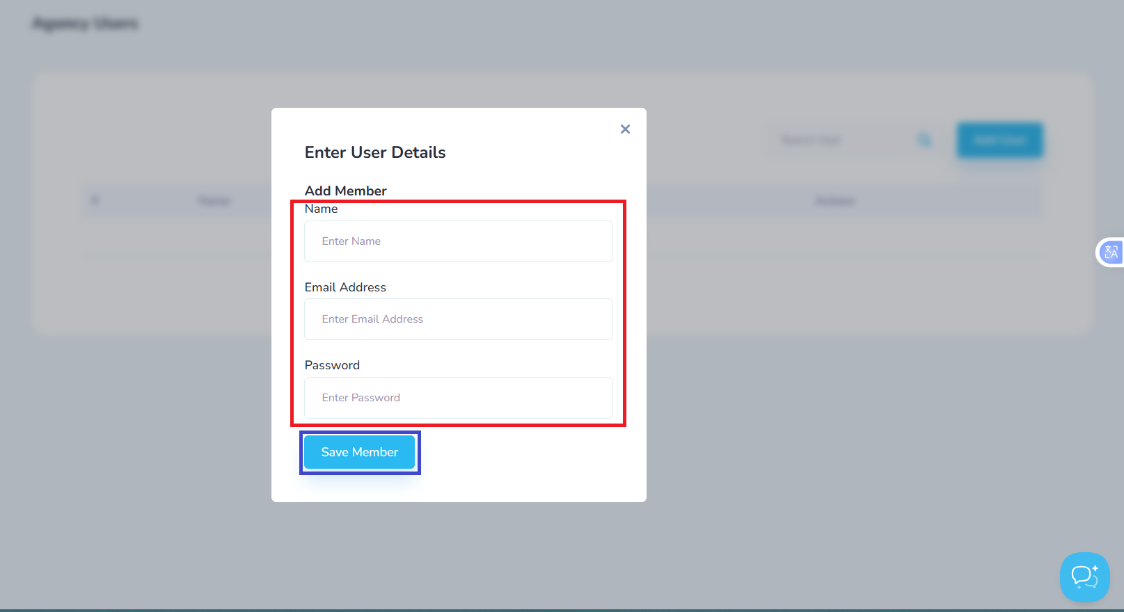 Enter the Agency clients Name, Email and Password, then click on the Save Member button.