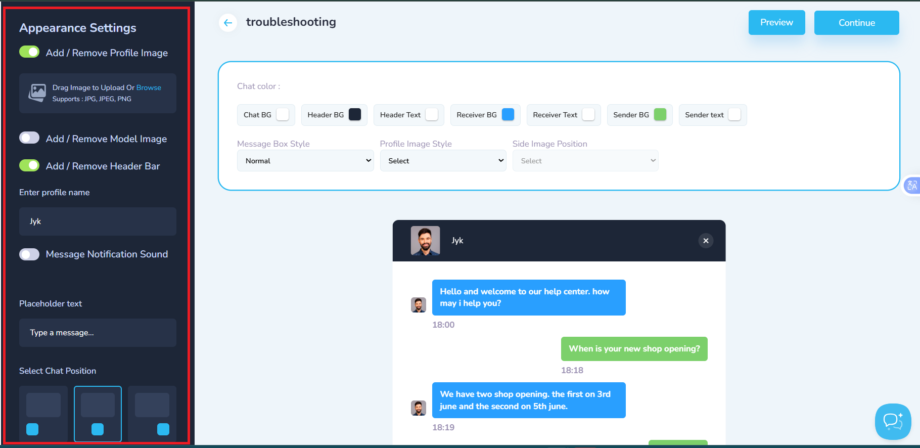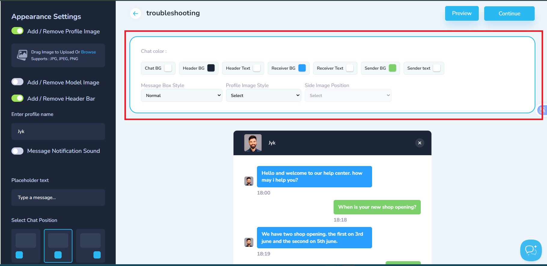 You can adjust the Appearance Settings with the menu by your left. Adjust profile image, header bar, profile name, message notification sound, placeholder text, and chat position